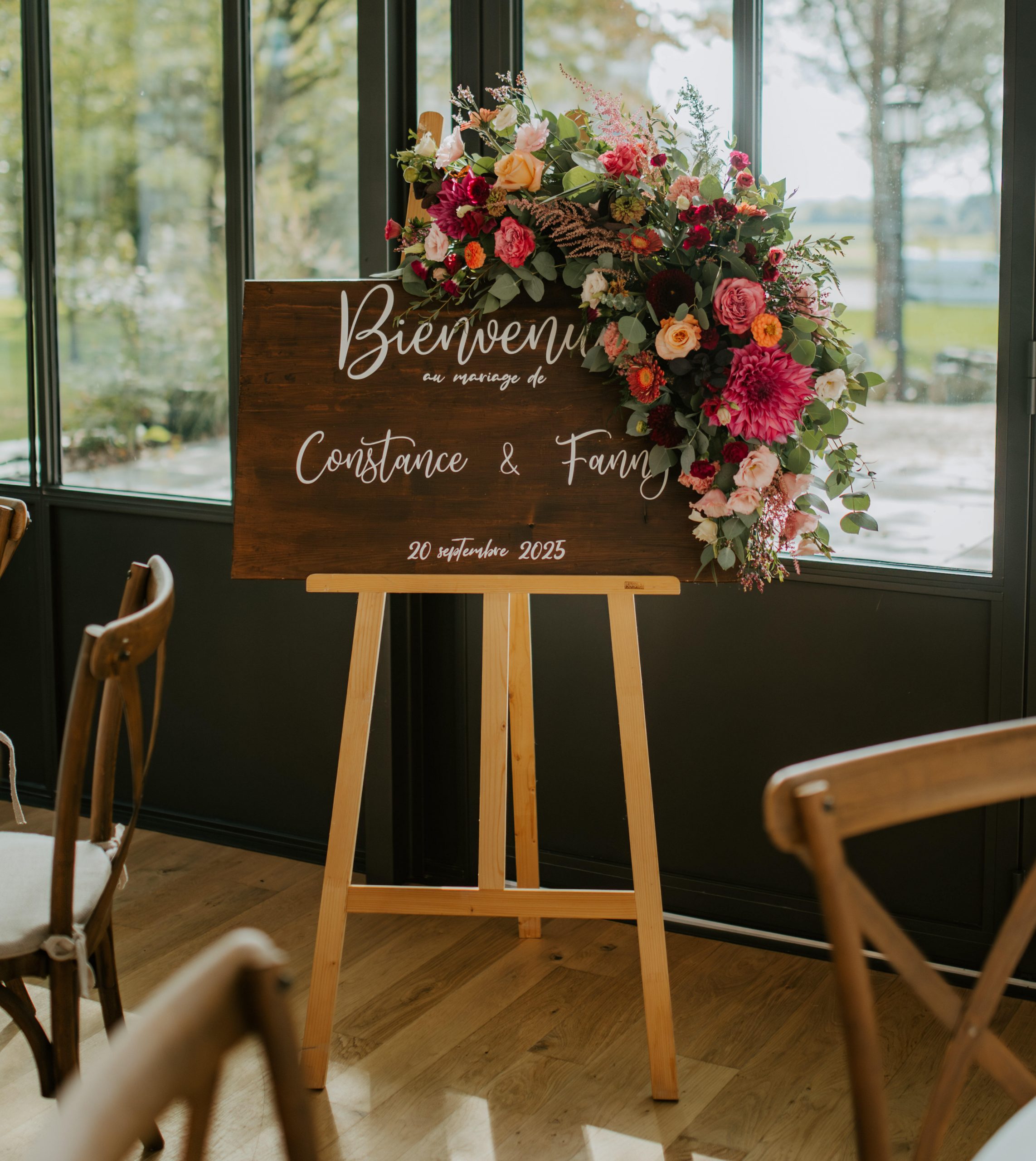 Pour sublimer ce lieu déjà plein de charme, Constance & Fanny ont fait le choix d’une décoration à la fois chic et vibrante. Les compositions florales, signées Pöla Artisan Fleuriste, dans un dégradé de rose viennent réchauffer l’ambiance et apporter du caractère à chaque espace.