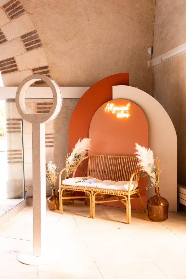 Backdrop forme arche composé de 3 panneaux en bois : petit panneau beige, panneau moyen orange, grand panneau terracotta.