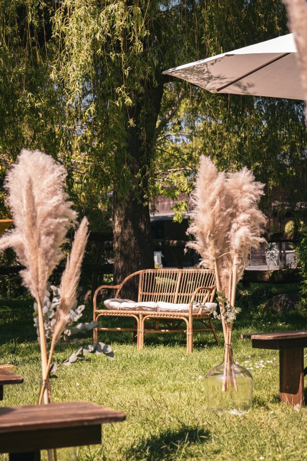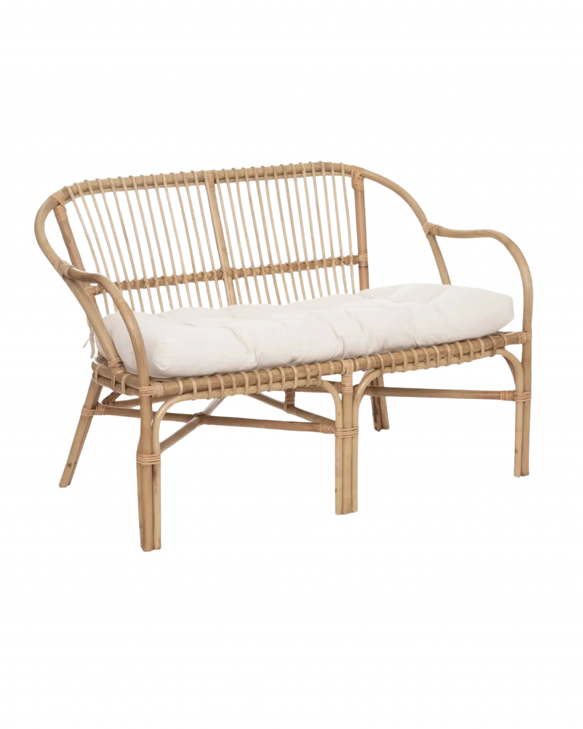 Banquette en rotin 2 places avec coussin d'assise en tissus beige compris dans la location.