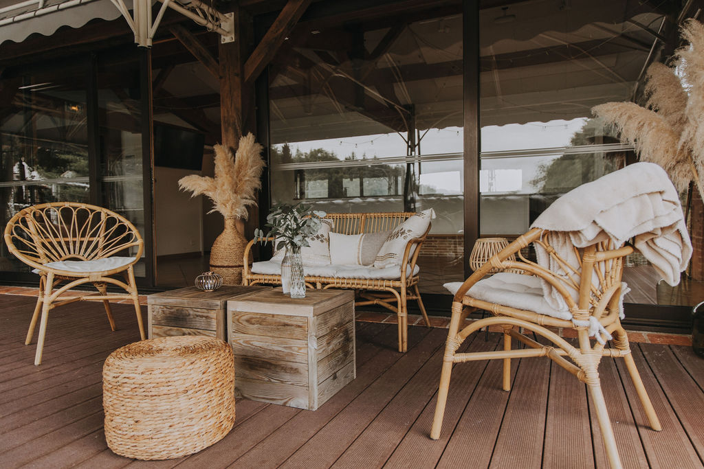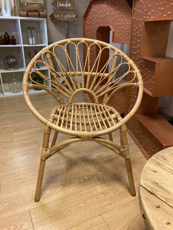 Chaise en rotin avec coussin d'assise en tissus beige compris dans la location.