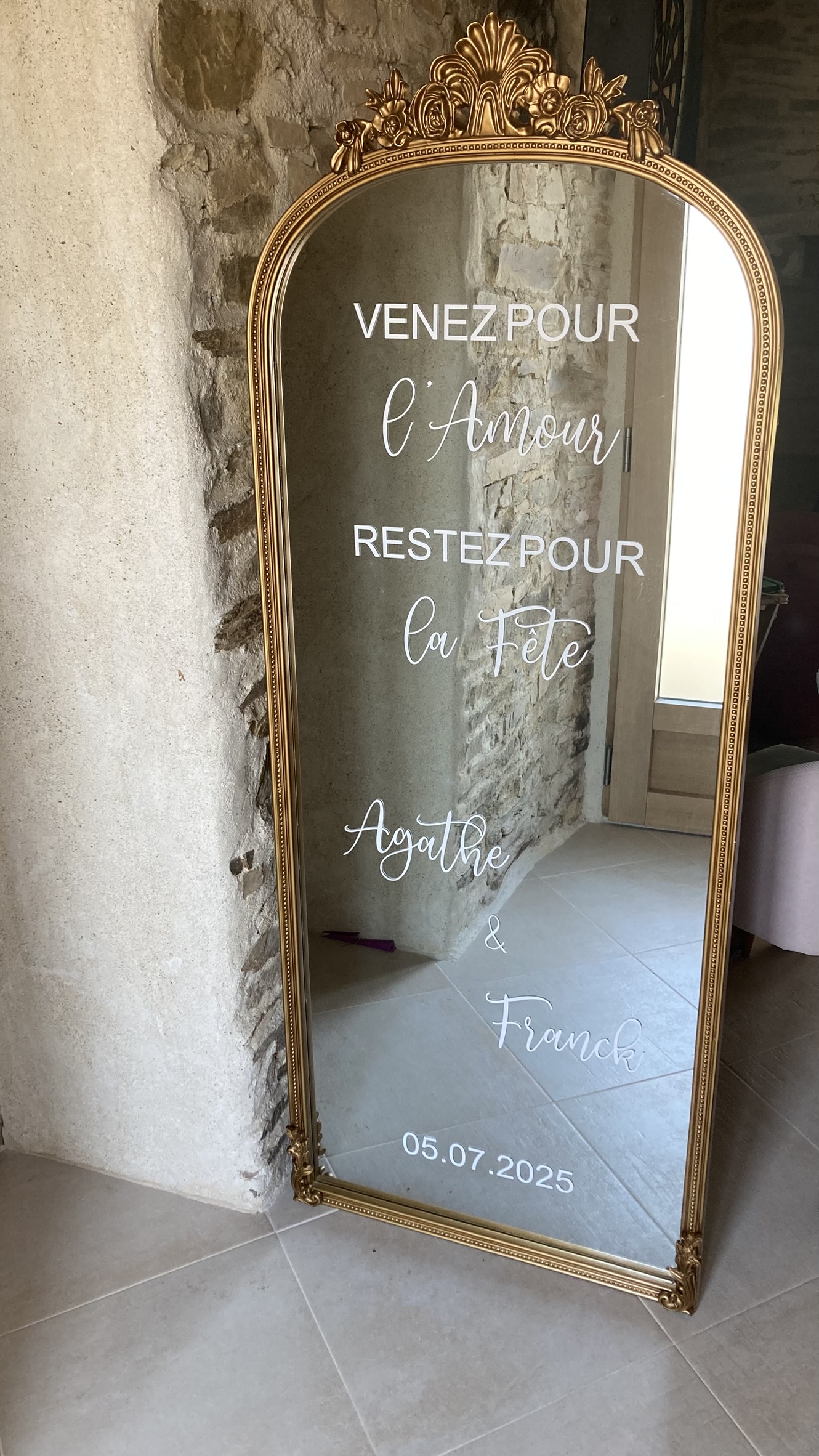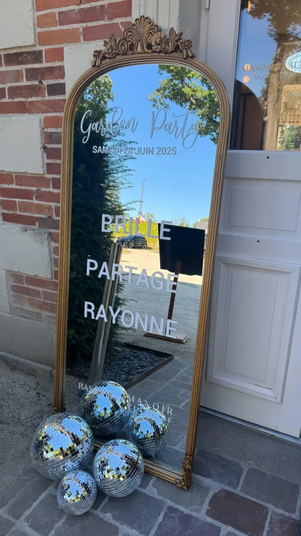 La location comprend le miroir doré grand modèle + la personnalisation sous forme de stickers.