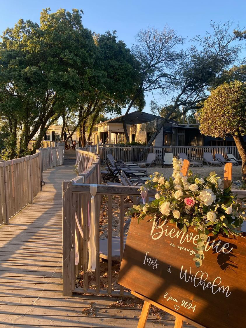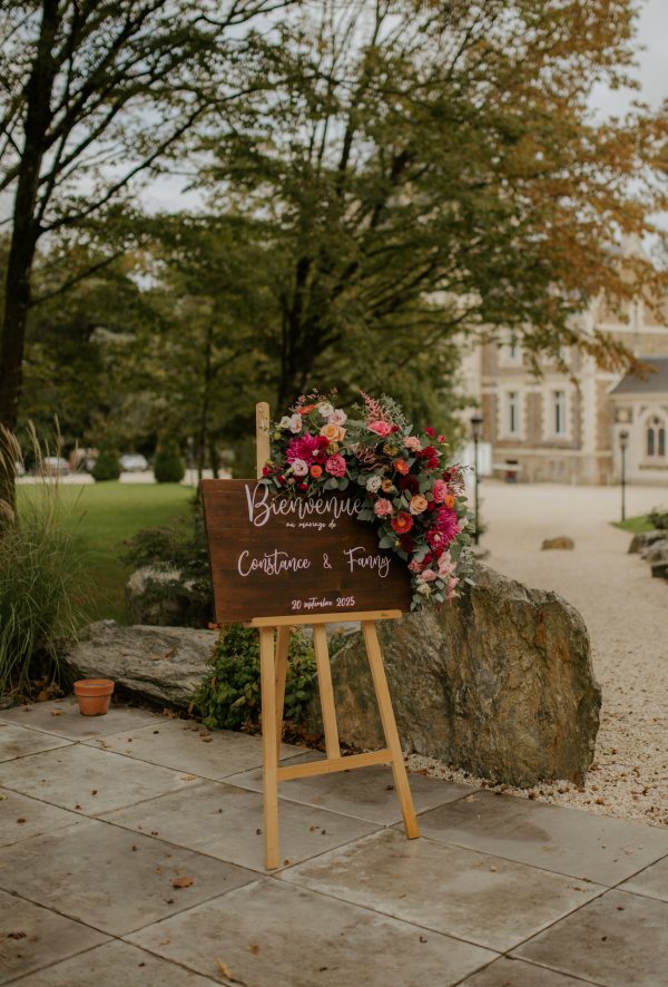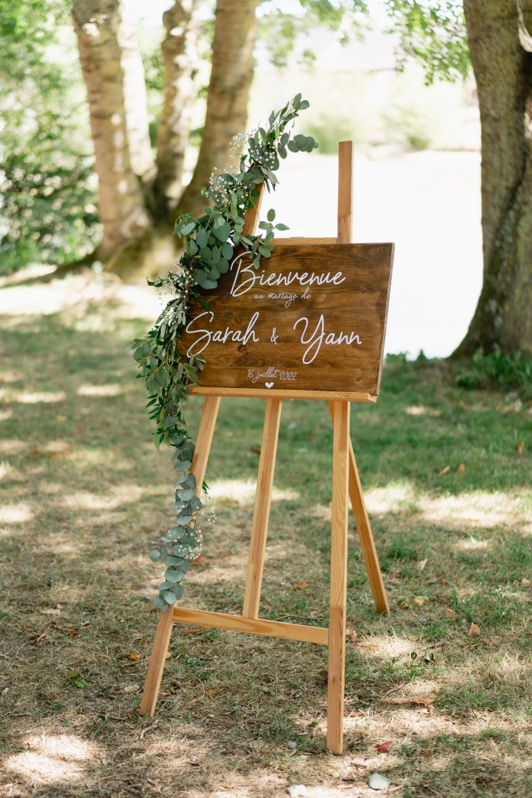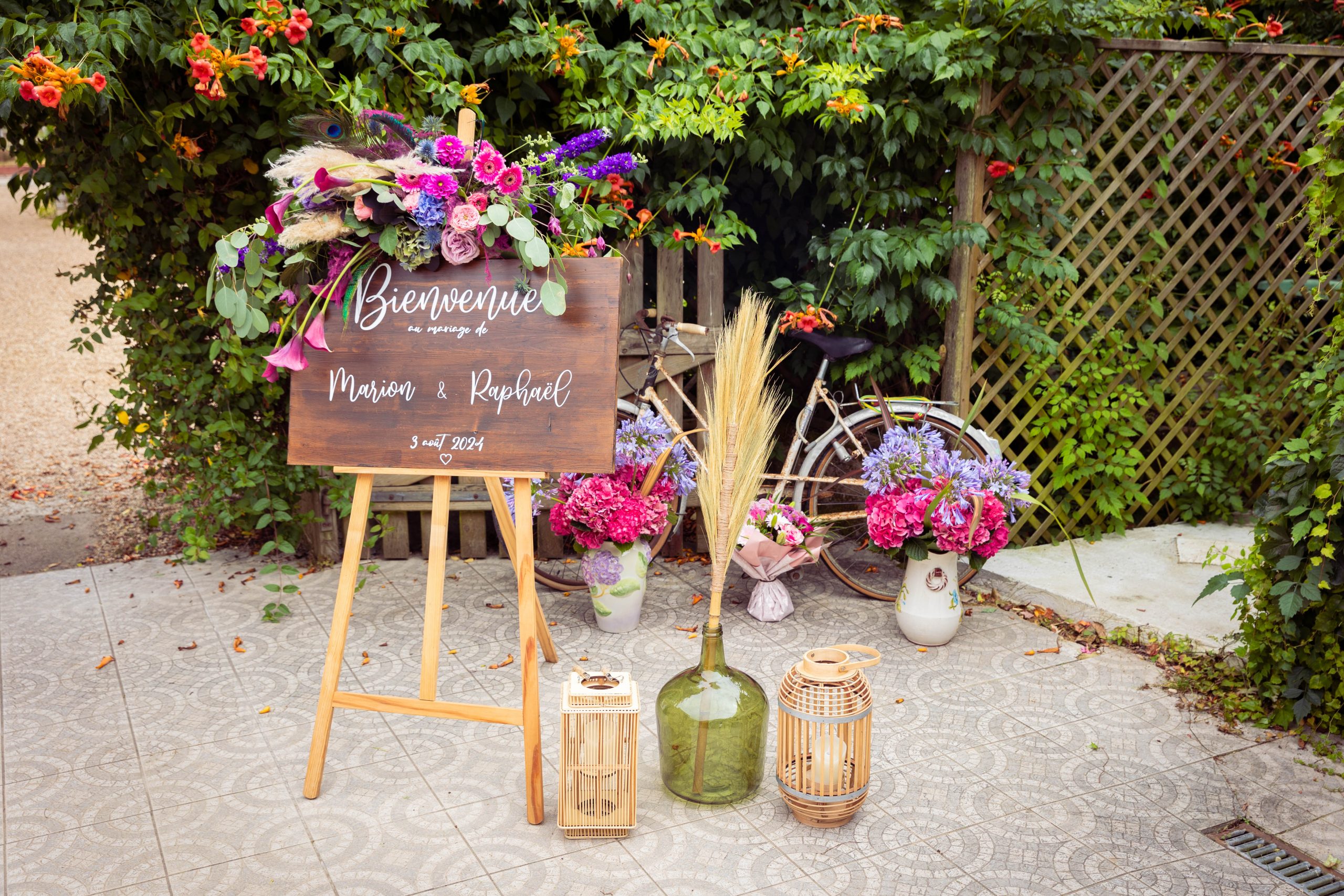 La location comprend le panneau en bois + un chevalet en bois + la personnalisation "Bienvenue au mariage de Prénom 1 & Prénom 2 Date".