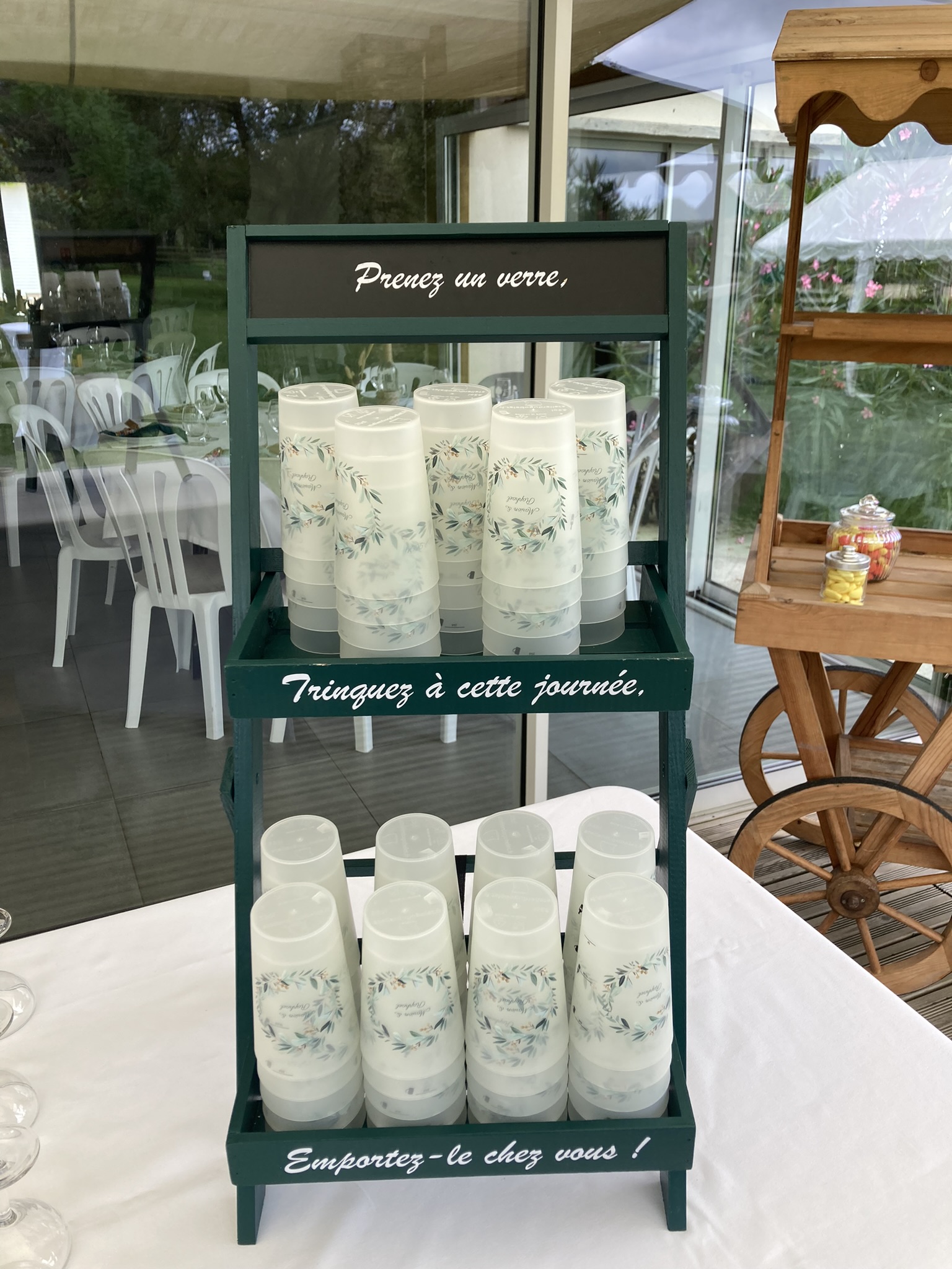 La location comprend la personnalisation "Prenez un verre, Trinquez à cette journée, Emportez-le chez vous !"