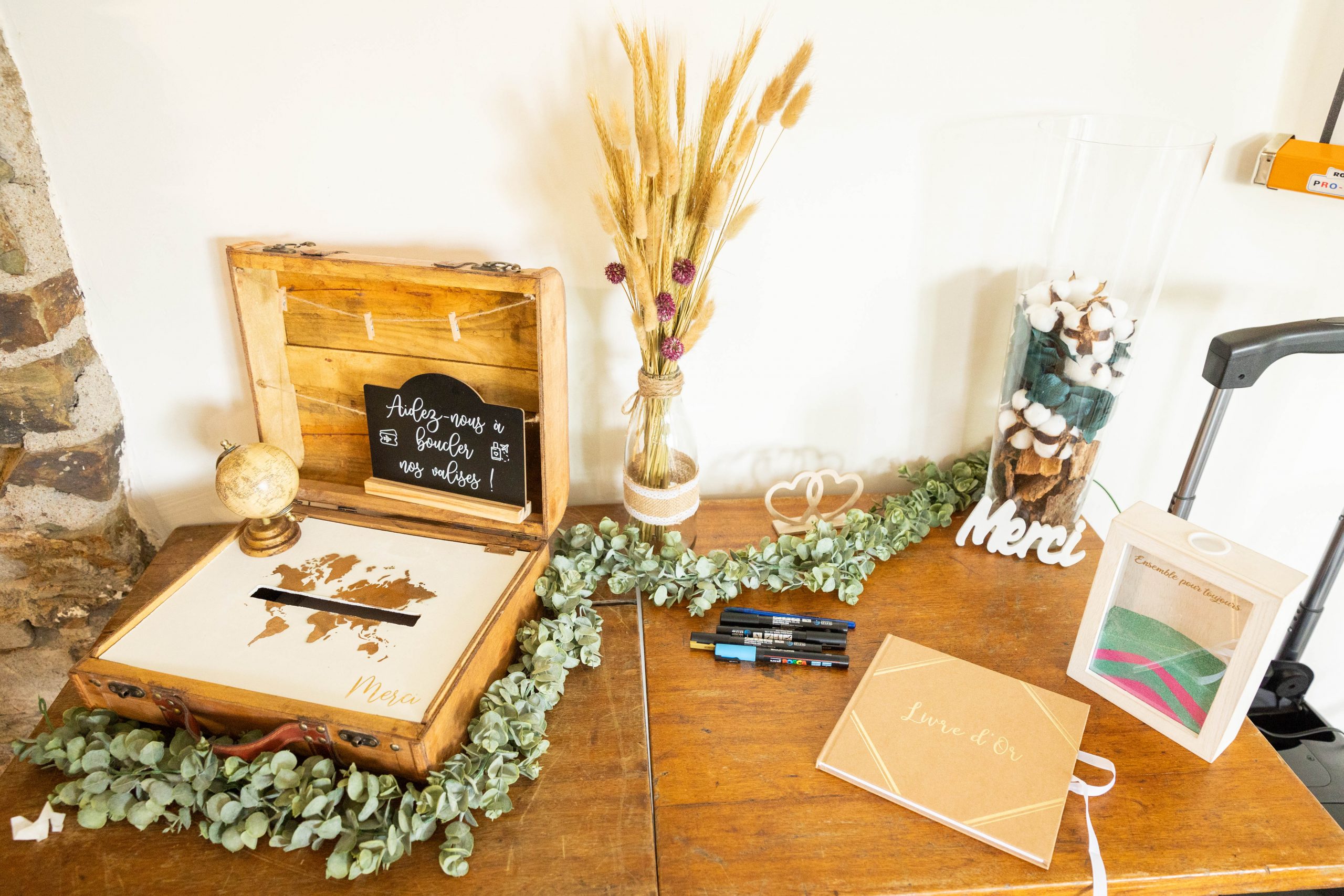 Possibilité d'ajouter en supplément la petite ardoise avec message "Aidez-nous à boucler nos valises" ou tout autre message personnalisé voir article "Ardoise petit modèle personnalisée"